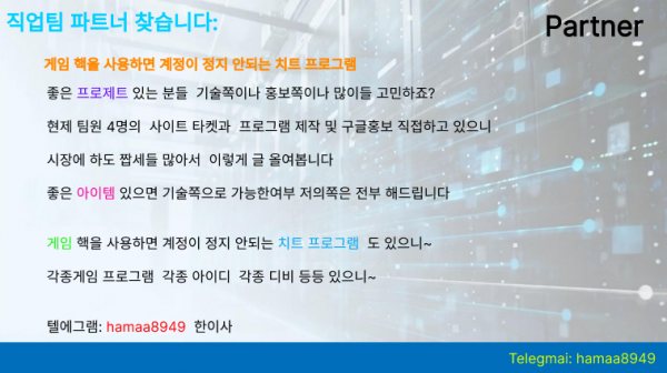 작업팀 파트너 찾습니다:Telegmai: hamaa8949 == 게임 핵을 사용하면 계정이 정지 안되는 치트 프로그램